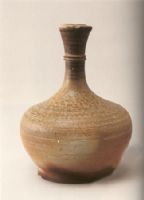 瓶细颈,圆鼓腹,平底,矮圈足。此瓶颈部近二分之一处有两道突出弦纹,状似竹节。