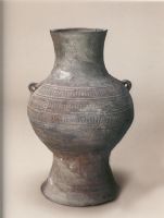 此壶侈口,长颈,圈足较高,腹部饰弦纹四组,其间加饰篦点纹。整个造型简单朴素,给人以稳重感