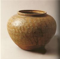 直口,矮颈,鼓腹,平底。器身佈满由杉叶纹所组成的方塊纹。施淡褐色釉。器物的造型和纹饰都脱胎於印纹陶。与之同类型有青瓷产品见於上虞小仙壇东汉窑址。