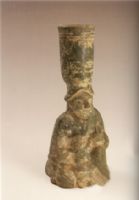 汉代十分流行以铅为助熔剂的低温釉,是汉代制陶工艺所取得的重大成就之一。这件绿釉陶灯,是以一个怀抱婴兒、长跪於地并头顶着筒形灯柱的奴婢形象制作的。整体造型完整厚重,体态生动,线条简洁,充分体现出朴实无华的艺术风格。
