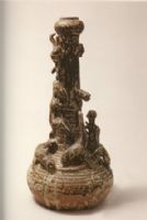 口似蒜头,细长颈,鼓腹,平底。颈上部塑有数只鸟,似在啄木,另塑有一只顽皮的猴子,似从树上往下爬,边爬边做着各种怪像。颈下部塑有一人,怀抱[大树],露着微笑。