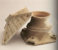 此井为灰陶质,井盖与井身分开,井身呈罐形,井口平缘,折肩,腹部有一道凸弦纹装饰,底缘呈四方形,四角各割去一小角,四角上各有一洞,应为放置支撑井盖的木条所用。