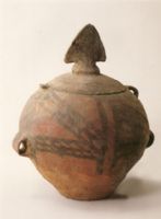 敛口、溜肩,深腹圆鼓、平底,口部与腹部各有对称双耳。口上腹盖有圆鼓顶菌状握手器盖。器青上腹部塗有一层红褐色陶衣,并用灰黑彩绘出宽竖条纹与平、斜双行方格纹。