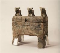 长方形直口、方唇、直壁、平底,四个方棱形平底足。口沿上覆盖有与鼎口大小相同的长方形直口、方唇直壁、平顶盖。别致的是在顶盖上塑有三个立犬。犬的四肢直立,昂头翘尾,姿态生动而逼真。并在器表施红彩,造型奇特,具有较高的艺术价值,系彩陶中所罕见。