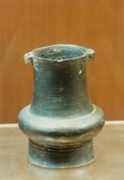 敞口,长颈,扁腹,喇叭形圈足,足部有双孔。双贯耳。器表乌黑发亮。