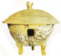 鼓腹,平底,腹下設三個獸足,腹一側鏤一長方形倉門。腹飾弦紋。配笠帽形蓋,鈕為一母雞。