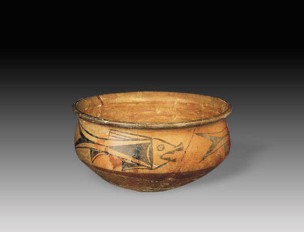 印纹陶摘要:印纹陶,在做好的陶坯上,趁未干前用印模将所需花纹在所定部位捺印上去后进行烧制。依其烧制温度的低高,又分为印纹软陶和印纹硬陶。前者又有泥质与细砂质之分,多呈红褐、灰白、灰等色,多流行于新石器时代晚期至商代以前;后者因烧制时温度较高,故胎质坚硬,呈灰色,系在前者基础新石器时代仰韶文化鱼纹彩陶盆上发展起来,其出现年代约在商代以后。印纹陶的器形大多为日常生活用具,主要有瓮、坛、罐、盂、钵、杯、盘、豆、簋、尊、□等器皿。制作方式为手制、模制和轮制。其纹饰是用印模在作好的坯胎上捺印出来,最初只是出于防止器物变形,有加固陶坯的目的,故早期的印纹陶上多留有布纹、席纹和绳纹的痕迹,后随技术的提高和人们审美能力的发展,逐渐使纹样趋于丰富、精美。印纹陶的纹样均为几何形,主要有水波纹、米字纹、回纹、方格纹、编织纹、云雷纹。其纹饰多与器形相协调,如曲折纹、云雷纹、回纹等较粗犷的纹样,多用于瓮、坛及较大的罐等。而小件的盂、钵等多饰以米字纹、方格纹等细密、秀美的纹样,其中尤以商、西周、春秋时期的纹饰线划均匀,结构严谨,且富有韵律感。印纹陶的装饰工序,寄寓于器物脱坯后的压印过程中,制作较为简单,且一旦制成模具,即使不会刻画的人,也能从事捺印。因此,简单易行,适合大量生产,故它在一定区域内获得极大发展,成为中国新石器时代晚期以来具有鲜明地域特征的一种制陶工艺。它主要流行于浙江、江苏、上海、福建、广东、广西、台湾、江西、安徽等省区,盛行于商、西周、春秋,战国时期随着暗纹陶、彩绘陶器等的兴起和迅速发展,而走向衰落,至汉代以后逐渐消失。