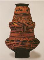 小口、沿外卷、厚圆唇,长颈斜外侈,上小下大双扁圆腹,束腰、假圈足、平底。除颈有三个对称乳钉纹外,通体用黑、红两色矿物原料,彩绘出横条纹、斜线纹、云雷纹、三角纹等图案装饰。造型别致,色彩鲜艳,纹样醒目而华丽,极富地方特色。