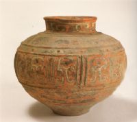 敞口、短颈、鼓腹、假圈足。器表饰红、白彩绘图案,颈部、下腹部饰勾云纹,肩部饰钮状弦纹、乳钉纹、齿状纹,腹部饰卷云纹,相间有乳钉纹,肩、腹部饰弦纹。线条流畅,造型精美。