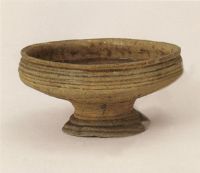 上为直口微敛,壁略鼓、圜底、浅盘,下为喇叭形座。通体饰并列弦纹,器表施青绿色釉。胎质坚硬,釉面晶亮。
