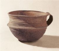 直口微侈,颈略收,折肩、浅腹、平底,口沿与肩部间有一个扁体拱形耳。颈部饰数周平行弦纹。火候高,质坚硬,呈淡棕色。造型美观,胎质细腻,击之可发出清脆金石声。