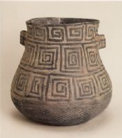口微敞,颈内收,深腹下部圆鼓,圆平底。颈部有对称双耳。颈与上腹部饰三排黑彩方体云雷纹,腹底饰黑彩小格纹。造型庄重,装饰华丽美观而又醒目,系罕见的工艺品。
