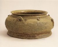 敛口、沿外侈,颈内收,扁圆腹,大圈足。肩部除有两个对称的索钮状横耳外,还有四个小突和两竖条附加堆纹,通体满饰规整的小方格纹。器表施青绿色釉。造型朴实,装饰美观,胎质坚硬,烧成温度也较高。