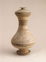 细泥彩陶。敞口,细长颈内收,扁圆腹,圈足。口上盖有带握手的器盖。通体用红、白彩绘制出弦纹与涡纹等彩色纹饰。
