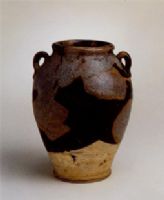 花釉传世品中以黑釉蓝斑块居多,此黑釉蓝斑双系罐,在肩腹处黑色的底釉上加浅灰蓝色的斑块,庄重古朴,典雅大方。