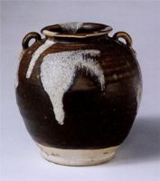 罐口外撇,短颈,圆腹,平底,肩部两面各有一系,器里外施黑褐色釉,外部施釉不到底,罐口和腹身各有三块及四块灰蓝色斑纹