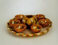 杯盘由葜平的大盘和五至七个不等数的平底小杯组成,此杯盘坦底,下承以三短足。上置五个小杯,通体黄,白,绿三彩鲜亮艳丽。唐三彩杯盘多烧结在一起,本身已失去了实用功能,应是一种明器。