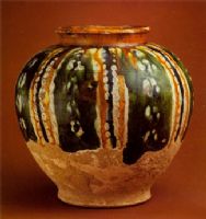 唐三彩至开元进入它的极盛时期,这一阶段之彩器产量大,质量高,色彩绚丽,此罐口边略向外卷,丰肩,肩以下渐收敛,平底。通体施黄,蓝,白三色釉,于釉上又涂饰蓝釉大斑块,形成色彩斑斓的艺术效果。