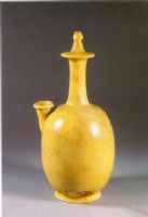 唇口,细长颈,颈部有一盘状凸棱。肩部有一唇口管状流。溜肩,腹部呈长圆形,底足外撇,胎质灰白,满施白色化妆土。釉白闪米黄色,开细小冰裂纹,施釉不及底,造型似仿唐代金银器。
