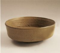 直口微外侈,浅腹直壁、矮圈足。碗内壁饰数周并列弦纹,碗表素面,通体施青黄色薄釉。造型精美,釉面晶亮。