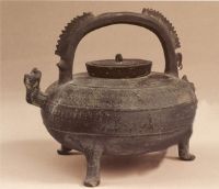 小口低领,口上盖有平顶直壁带钮盖。广肩,扁圆腹,圜底,三兽蹄形足。肩的前部有龙首流。相应肩的后部有小尾,流与尾间有一象征龙体的拱形提樑。樑脊上又饰有四段脊棱。器表满塗青绿色釉。系江浙地区东周时期盛行的提樑壶形器。