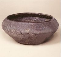 灰褐印纹硬陶。敛口、低领、宽肩、扁圆腹、平底。器表满饰蔴布纹,肩部加饰S形附加堆纹。形制规整,工艺精湛,火候颇高,胎质坚硬。