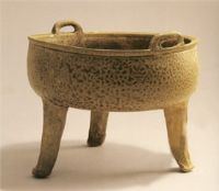 鼎尖唇折沿,口沿处置对称两竖耳,弧腹,平底,兽蹄形三足略外撇。胎质细腻致密,内外壁施青绿釉,釉层凝聚成不规则点状。原始瓷鼎是模仿铜礼器形式的一种明器。