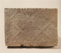 泥质灰陶。砖面近长方形,砖面上印制菱形几何图案纹饰.