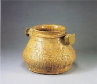 口沿外折,短颈,溜贱,鼓腹,平底。内外施茶黄色釉。底部无釉,胎体较坚致,颈部饰一圈凸棱和数周锯齿形刻划纹,肩部有两个鋬耳,腹部拍印双线勾联纹。此罐器形在原始瓷中比较罕见。