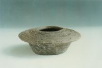 夹炭黑陶。圆唇,敛口,大宽沿,腹斜直,平底。宽沿上刻满弦纹,点纹组成的图案,还有两排等距小圆孔