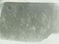 泥质灰陶。为长方形,上端厚而圆,有二个圆孔,下端刃部薄。两面均刻有纹饰。一面为兽面纹样,一面为一组云雷纹。线条纤细。