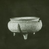 口沿外撇,短颈、鼓腹、三实足。腹部有两条锯齿状凸棱,肩腹部贴绳纹双系,外腹部饰变形云纹。釉层剥落。