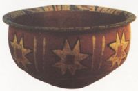 泥質红陶。侈口,宽沿,鼓腹,平底。器身凃红白陶衣及红、白、黑彩。口沿上相間繪相對的褐彩三角紋和紅黑豎條纹。腹部横向繪七個白色八角星,外以黑變勾勒。中間開红色方形空地。八角星之間以白色雙豎條紋相隔。