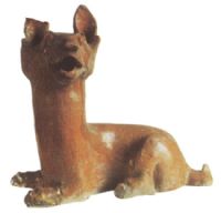泥質陶。狗體较瘦長,長颐,短尾。平卧地上,長颈挺直,颈向左偏,右耳半垂,左耳豎起,雙目瞪視,張口吠叫。通體施红褐色釉。