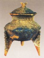 夾砂红陶。侈口,矮頸,宽肩,扁腹,足呈扁鑿形,脊有指捏成的锯齿纹。盖呈圆形,带一環形鈕。