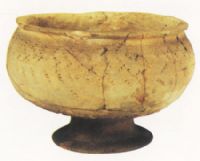 唇口,扁圆腹,喇叭足。胎體坚硬厚重。腹饰錐刺紋,细方格纹,類似“米"字紋的三重複合纹樣。