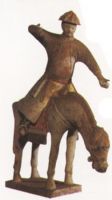 俑頭戴笠帽,五官俊朗,表情嚴肅,身穿束圓領膝短衣,腰繫带,带頭垂於右侧,足蹬長靴。馬剪鬃縛尾,直立於長方台座上,馬頭向下伸,鞍鞭齊全。俑雙手作持韁狀,似在勒馬駐足,施紅、白、黑等色彩。