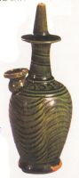 小口,長颈,圆肩,長腹下收,圈足,胎呈黄色。腹饰篦劃波浪纹,施绿釉。此浮瓶造型端莊,装饰技法集堆塑、劃花、模印於一身,纹饰清晰,绿釉鮮亮,胎質细腻。