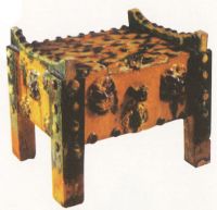 胎呈白色。錢櫃呈長方體,下承以四個方形柱腿,櫃顶有長方形盖。櫃體堆贴獸面紋、蓮瓣纹等。通體施黄、绿、红色彩釉。