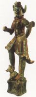 頭戴盔,面目猙獰,唇留短鬚。圍項護,身穿鎧甲,左手叉腰右手高舉,足穿長靴,右足下踩一小鬼,小鬼作掙扎状。其下是墩形圆台。面部舆手部為朱红彩,鎧甲描金。