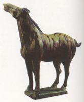馬頭向右高昂,張口嘶鳴。剪鬃束尾,馬身渾圓肥壮。四肢直立於長方形座上。馬身灰白釉為地,其上繪不规則的赭色豎斑纹。全身無馬具。