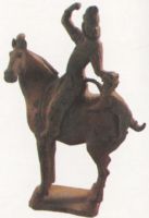 俑頭包软巾,深目高鼻,络腮鬍鬚,為胡人形象,上身穿翻领胡服。馬背後有一只猛獸,呲牙咧嘴,向馬背上人攻擊。胡人轉身左手揪住野獸颐上鬃毛,右手高高舉起正要擊向野獸頭部。胯下騎馬施紅彩,頭顶兩耳中間有一束高鬃毛,四肢健壮,立於長方形踏板上。