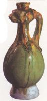 侈口,细長颈,溜肩,鼓腹,平底,假圈足。口下塑獸頭,舆肩上的莲花形瑗柄形環柄相接成把手。器施綠釉為地,上施棕褐色及白色彩饰。
