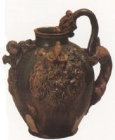 小口,短粗颈,溜肩,鼓腹,平底。肩部一侧置龍首形流,其下贴塑獸頭。另一侧為龍形把手。腹部兩侧各堆塑人物形象和團花花纹。器身施以绿釉及黄釉。