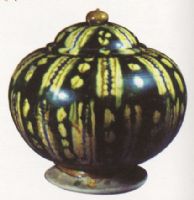 胎呈白色,斂口,豐肩,鼓腹,矮圈足。配圓形蓋,上有寶珠形鈕。器身施綠釉為地,上飾黃褐色的圓點和寬帶紋。