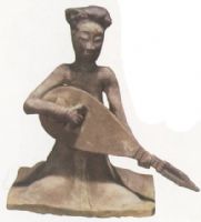 泥質灰陶。俑顶梳平髻,後插梳,身穿長裙,跪坐,雙手抱一五弦頸琵琶,左手持器,右手弹奏。用綠、紅、黑諸彩装饰。