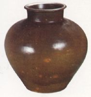 泥質陶。口微侈,沿外捲,直颈,豐肩,鼓腹,下渐收成平底。器通體施褐釉,釉色泛黄。