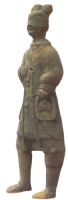泥質紅陶。俑頭戴高帽,身穿短衣,胸前佩環首長刀,左手提一箕,右手握長棍。此俑形體高大,人物塑造比例適當,神情威嚴,形象逼真,顯示出四川地區漢代制陶技藝的高水平。