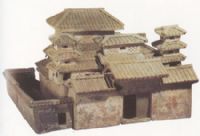 陶莊園由庭院和田圜兩大部分组成。庭院為三進院落。門樓兩侧有向對稱的三重薝四層角鏤。中庭的主题建築為二層樓閣。殿內有六個伎樂俑,分别作弹琴、吹竿、拍手等動作,俑前置陶盤、耳杯等饮食器,應為主人生前宴樂場所。中庭左侧有糧倉。後院為廚房、厕所、猪圈等設施。此座陶莊園模型规模宏大,建築結構嚴謹,是當時地主莊園經濟發展的真實寫照。