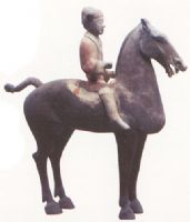泥質灰陶。馬四腿直立於地,昂首嘶鳴,短尾上翘,全身施红彩。馬背上骑一武士,目視前方,頭繫巾子,身穿戰袍,左手持韁,右手紧握兵器,身饰紅、白彩繪。陶馬高大健壮,武士俑年轻威武,造型優美洗練,表现出西漢陶塑鋬藝術質樸雄健的風格。